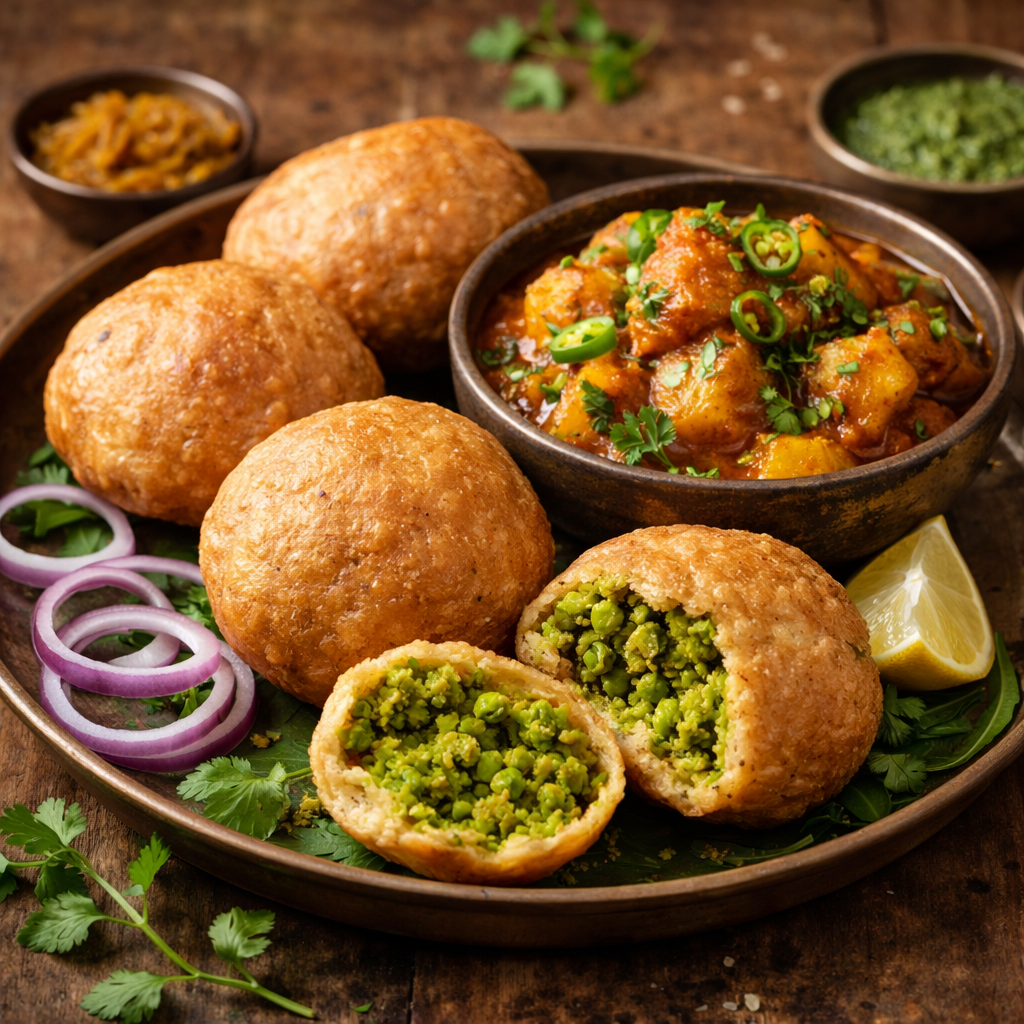 Crispy golden kachori stuffed with spiced green peas, delivering a burst of authentic flavor in every bite.